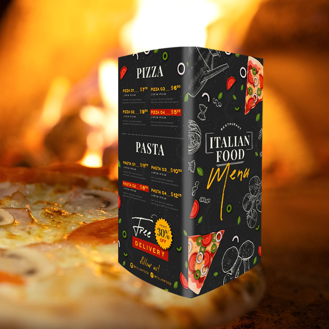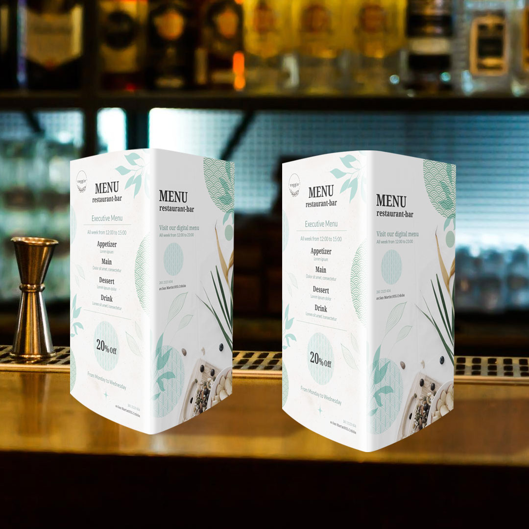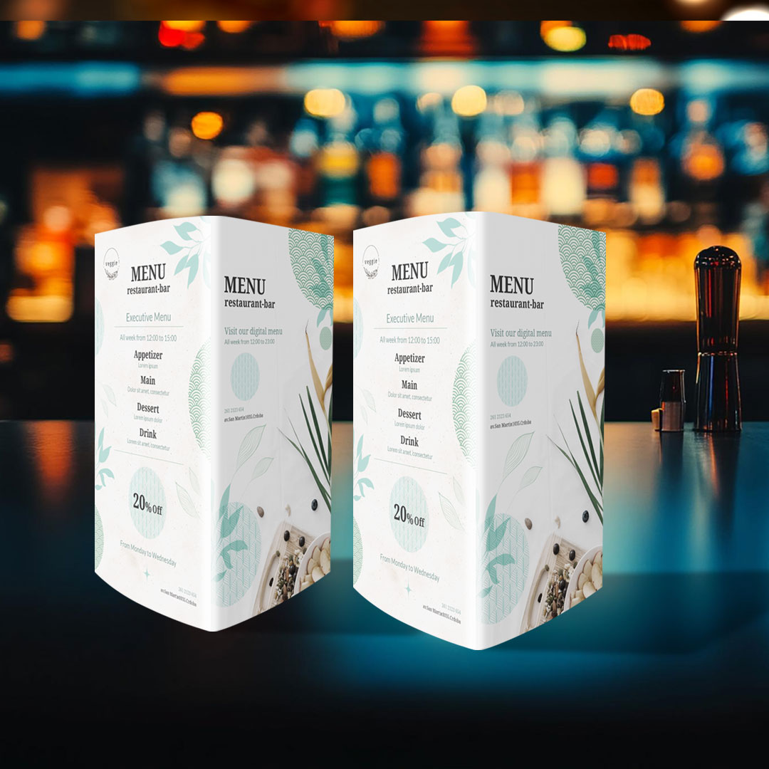 La carta tipo tótem alto es una opción moderna y llamativa para restaurantes o bares que quieran presentar su menú de forma clara y atractiva. Gracias a su diseño triangular, se mantiene estable en la barra o en la mesa central, asegurando una gran visibilidad para los clientes.